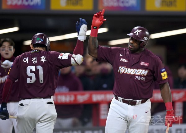 8일 인천 SSG랜더스필드에서 ‘2022 신한은행 MY CAR KBO리그’ 한국시리즈 6차전 키움 히어로즈와 SSG 랜더스 경기가 열렸다. 6회초 1사 키움 이정후가 다시 앞서가는 우월 솔로 홈런은 날리고 그라운드를 돌아 홈인해 푸이그와 하이파이브 하고 있다.