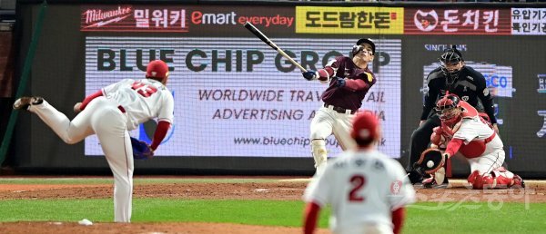 8일 인천 SSG랜더스필드에서 열린 ‘2022 신한은행 SOL KBO리그’ 한국시리즈 6차전 SSG 랜더스와 키움 히어로즈의 경기에서 8회초 2사 키움 이정후가 헛스윙 삼진을 당하고 있다.