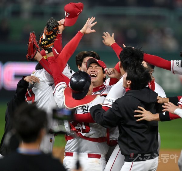 8일 인천 SSG랜더스필드에서 ‘2022 신한은행 MY CAR KBO리그’ 한국시리즈 6차전 키움 히어로즈와 SSG 랜더스 경기가 열렸다. 한국시리즈 우승을 차지한 SSG 선수들이 환호하고 있다.