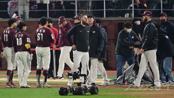 8일 인천 SSG랜더스필드에서 열린 ‘2022 신한은행 SOL KBO리그’ 한국시리즈 6차전 SSG 랜더스와 키움 히어로즈의 경기에서 3-4로 패하며 준우승이 그친 키움 선수들이 아쉬워하고 있다.
