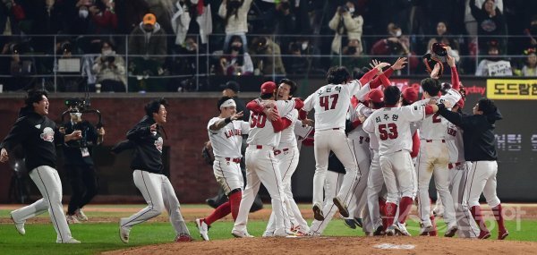 8일 인천 SSG랜더스필드에서 열린 ‘2022 신한은행 SOL KBO리그’ 한국시리즈 6차전 SSG 랜더스와 키움 히어로즈의 경기에서 4-3으로 승리한 SSG가 한국시리즈 우승을 차지한 후 선수들이 세리머니를 하고 있다.