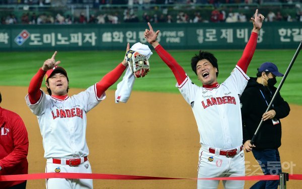8일 인천 SSG 랜더스필드에서 ‘2022 신한은행 SOL KBO리그’ SSG 랜더스와 키움 히어로즈의 한국시리즈 6차전 경기가 열렸다. SSG가 통합우승을 차지한 후 최정과 김광현이 팬들을 향해 환호하고 있다.