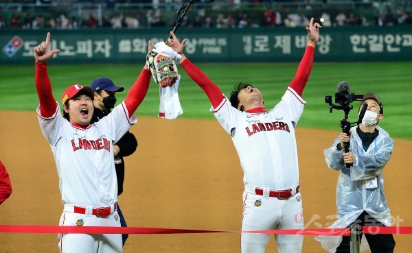 8일 인천 SSG 랜더스필드에서 ‘2022 신한은행 SOL KBO리그’ SSG 랜더스와 키움 히어로즈의 한국시리즈 6차전 경기가 열렸다. SSG가 통합우승을 차지한 후 최정과 김광현이 팬들을 향해 환호하고 있다.