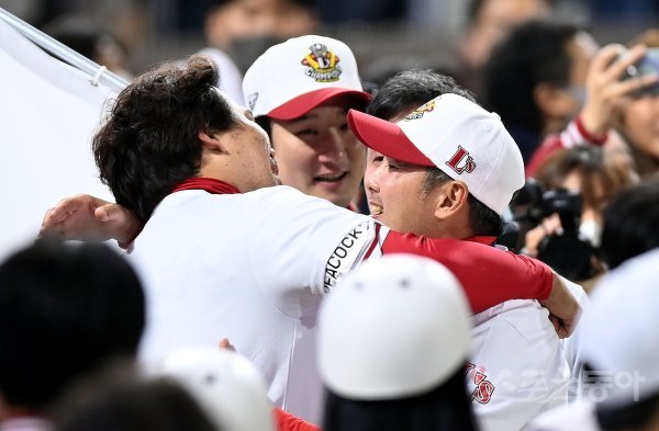 8일 인천 SSG 랜더스필드에서 ‘2022 신한은행 SOL KBO리그’ SSG 랜더스와 키움 히어로즈의 한국시리즈 6차전 경기가 열렸다. SSG가 통합우승을 차지한 후 최정과 김원형 감독이 부상을 당한 한유섬과 기쁨을 나누고 있다.