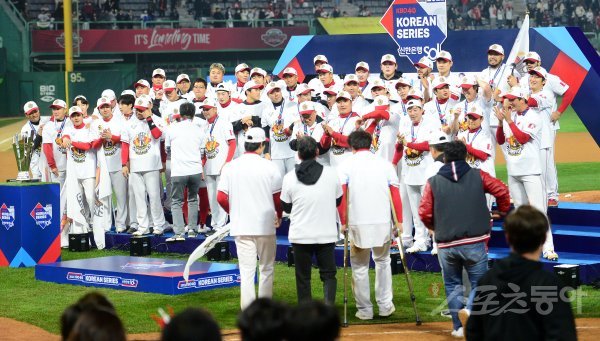 8일 인천 SSG랜더스필드에서 ‘2022 신한은행 MY CAR KBO리그’ 한국시리즈 6차전 키움 히어로즈와 SSG 랜더스 경기가 열렸다. SSG가 4-3 승리를 거두며 시리즈 전적 4승 2패로 한국시리즈 우승을 차지했다. 선수단이 부상으로 병원을 다녀온 한유섬을 반기고 있다.