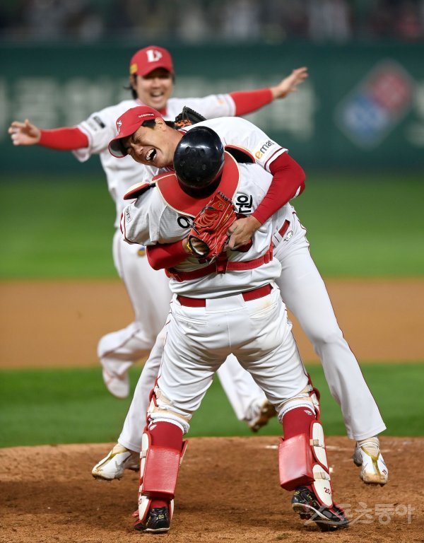 8일 인천 SSG랜더스필드에서 ‘2022 신한은행 MY CAR KBO리그’ 한국시리즈 6차전 키움 히어로즈와 SSG 랜더스 경기가 열렸다. 한국시리즈 우승을 차지한 SSG 선수들이 환호하고 있다.