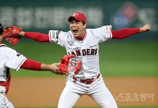 8일 인천 SSG랜더스필드에서 ‘2022 신한은행 MY CAR KBO리그’ 한국시리즈 6차전 키움 히어로즈와 SSG 랜더스 경기가 열렸다. SSG가 4-3 승리를 거두며 시리즈 전적 4승 2패로 한국시리즈 우승을 차지했다. 김광현이 환호하고 있다.