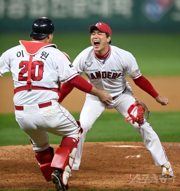 8일 인천 SSG랜더스필드에서 ‘2022 신한은행 MY CAR KBO리그’ 한국시리즈 6차전 키움 히어로즈와 SSG 랜더스 경기가 열렸다. SSG가 4-3 승리를 거두며 시리즈 전적 4승 2패로 한국시리즈 우승을 차지했다. 김광현이 환호하고 있다.