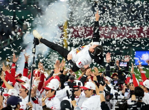 8일 인천 SSG랜더스필드에서 ‘2022 신한은행 MY CAR KBO리그’ 한국시리즈 6차전 키움 히어로즈와 SSG 랜더스 경기가 열렸다. SSG가 4-3 승리를 거두며 시리즈 전적 4승 2패로 한국시리즈 우승을 차지했다. 정용진 구단주가 헹가래를 받고 있다.