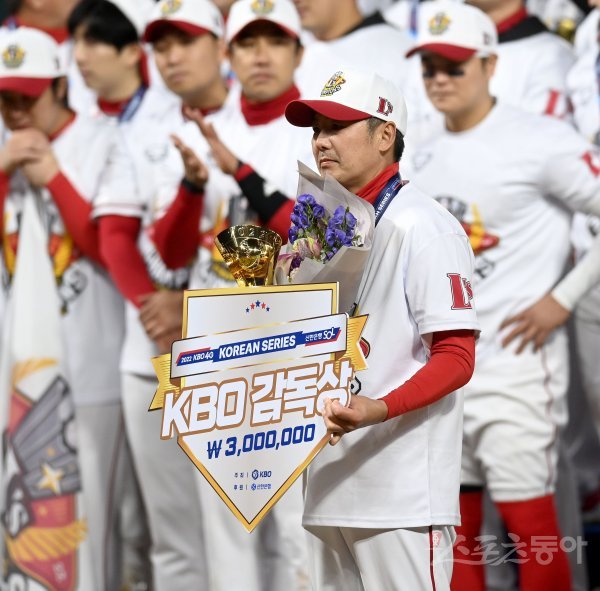 8일 인천 SSG랜더스필드에서 ‘2022 신한은행 MY CAR KBO리그’ 한국시리즈 6차전 키움 히어로즈와 SSG 랜더스 경기가 열렸다. SSG가 4-3 승리를 거두며 시리즈 전적 4승 2패로 한국시리즈 우승을 차지했다. 감독상을 수상한 김원형 감독이 기념촬영을 하고 있다.