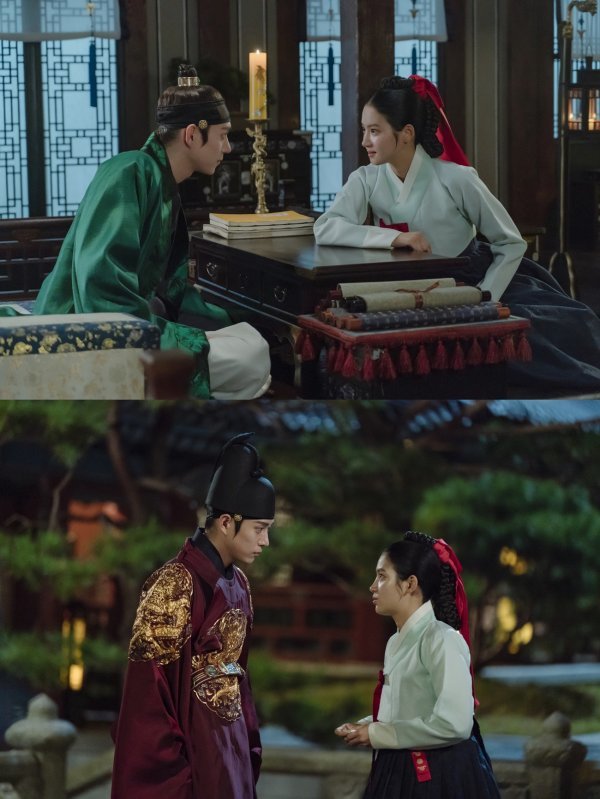이날 공개된 스틸 속 소랑이 경상 위에 팔을 얹은 채 왕 이헌을 바라보고 있는 모습이 인상적이다. 궁녀가 기세등등하게 왕을 대할 만한 사연이 무엇일지 두 사람의 관계가 궁금해지는 대목.