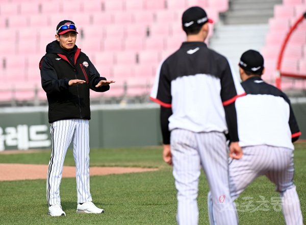 9일 경기도 이천 LG챔피언스파크에서 열린 LG 마무리캠프에서 염경엽 신임 감독이 2군 선수들을 지도하고 있다.