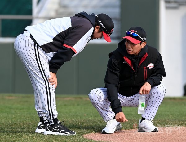 9일 경기도 이천 LG챔피언스파크에서 열린 LG 마무리캠프에서 염경엽 신임 감독이 박용근 코치와 이야기를 나누고 있다.