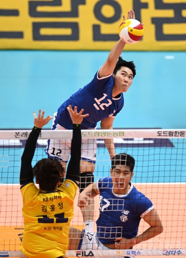 9일 의정부체육관에서 열린 ‘2022~2023 도드람 V-리그’ 남자부 KB손해보험과 현대캐피탈 경기에서 현대캐피탈 전광인이 KB손해보험의 블로킹 사이로 스파이크를 날리고 있다.