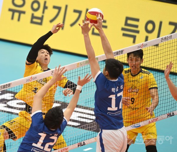 9일 의정부체육관에서 열린 ‘2022~2023 도드람 V-리그’ 남자부 KB손해보험과 현대캐피탈 경기에서 KB손해보험 김홍정이 현대캐피탈의 블로킹 사이로 밀어넣기 공격을 있다.