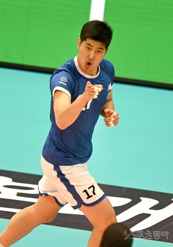 9일 의정부체육관에서 열린 ‘2022~2023 도드람 V-리그’ 남자부 KB손해보험과 현대캐피탈 경기에서 현대캐피탈 박상하가 블로킹 득점에 성공한 후 환호하고 있다.