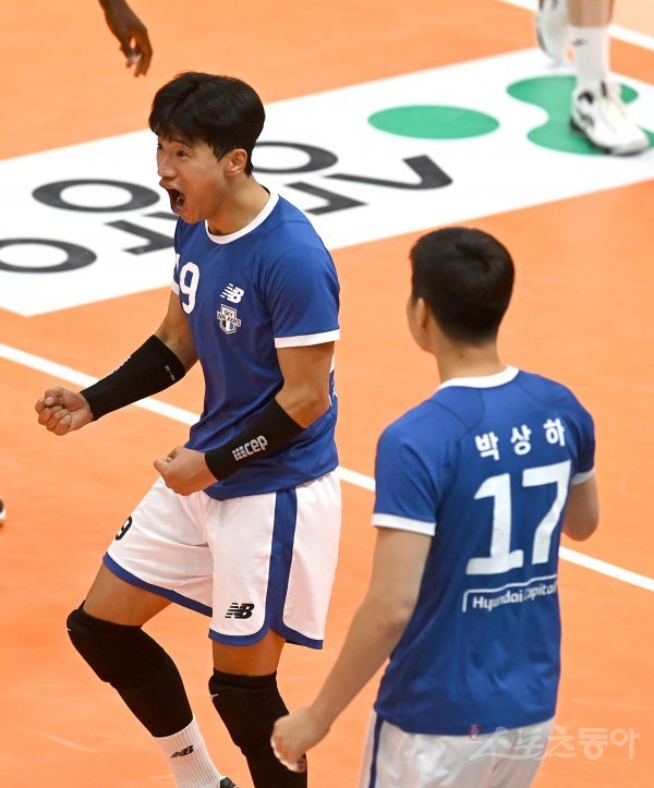 9일 의정부체육관에서 열린 ‘2022~2023 도드람 V-리그’ 남자부 KB손해보험과 현대캐피탈 경기에서 현대캐피탈 이원종이 득점에 성공한 후 환호하고 있다.