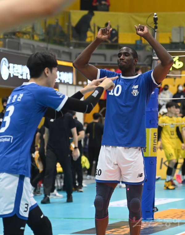 9일 의정부체육관에서 열린 ‘2022~2023 도드람 V-리그’ 남자부 KB손해보험과 현대캐피탈 경기에서 세트스코어 3-0 완승을 거둔 후 현대캐피탈 오레올이 기뻐하고 있다.