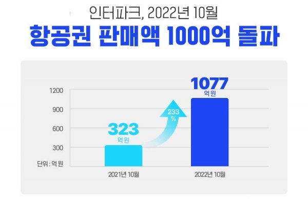 인터파크 항공권 판매액이 월간 1000억 원을 돌파했다.인터파크에 따르면 10월 한 달간 발권한 항공권 판매액은 1077억원으로 전년 동기에 비해 233% 급증했다. 코로나 이전인 2019년 10월과 비교해서도 8% 증가했다.