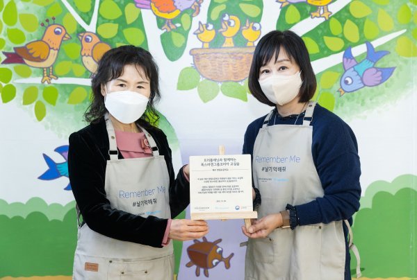 지난 10월 제주 한림초등학교에서 리멤버 미(#날 기억해줘) 프로젝트 환경교육이 진행됐다. 폭스바겐그룹코리아 이수진 상무(오른쪽)와 한림초등학교 홍미옥 교장이 기념 촬영하고 있다. 사진제공|폭스바겐코리아