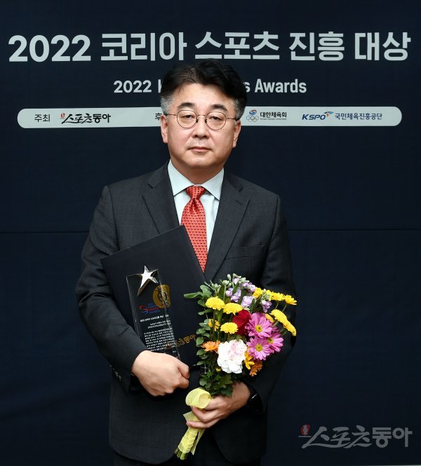 스포츠동아가 주최하고 문화체육관광부, 대한체육회, 국민체육진흥공단이 후원하는 ‘2022 코리아 스포츠진흥 대상’ 시상식이 10일 서울 종로구 광화문 동아일보사옥에서 개최됐다. 프로농구 브랜드 부문 전주KCC이지스프로농구단 조진호 사무국장이 기념촬영을 하고 있다.