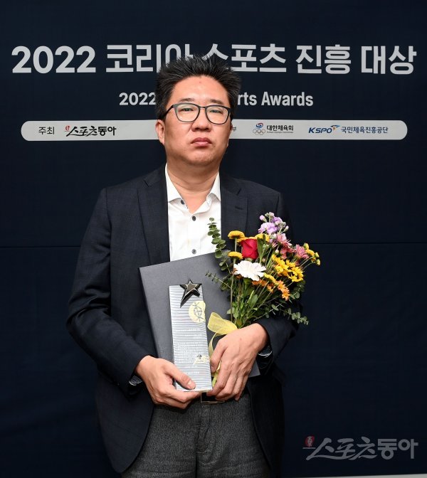 스포츠동아가 주최하고 문화체육관광부, 대한체육회, 국민체육진흥공단이 후원하는 ‘2022 코리아 스포츠진흥 대상’ 시상식이 10일 서울 종로구 광화문 동아일보사옥에서 개최됐다. 프로야구 브랜드 부문을 수상한 SSG랜더스 류선규 단장이 기념촬영을 하고 있다.