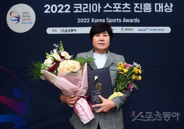 스포츠동아가 주최하고 문화체육관광부, 대한체육회, 국민체육진흥공단이 후원하는 ‘2022 코리아 스포츠진흥 대상’ 시상식이 10일 서울 종로구 광화문 동아일보사옥에서 개최됐다. 프로스포츠 마케팅 부문을 수상한 (주)한국여자프로골프투어 강춘자 대표가 기념촬영을 하고 있다.
