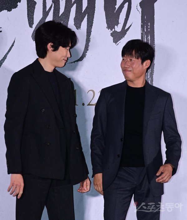 배우 류준열과 유해진이 10일 서울 용산구 CGV용산아이파크몰점에서 열린 영화 ‘올빼미’ 언론시사회에서 포즈를 취하고 있다.