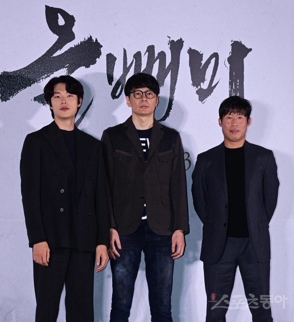 배우 류준열, 안태진 감독, 유해진이 10일 서울 용산구 CGV용산아이파크몰점에서 열린 영화 ‘올빼미’ 언론시사회에서 포즈를 취하고 있다.