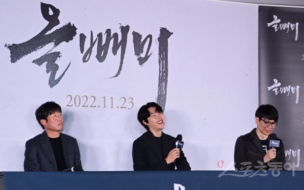 배우 류준열이 10일 서울 용산구 CGV용산아이파크몰점에서 열린 영화 ‘올빼미’ 언론시사회에서 안태진 감독의 답변에 웃고 있다.