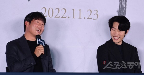 배우 류준열이 10일 서울 용산구 CGV용산아이파크몰점에서 열린 영화 ‘올빼미’ 언론시사회에서 유해진의 답변에 웃고 있다.