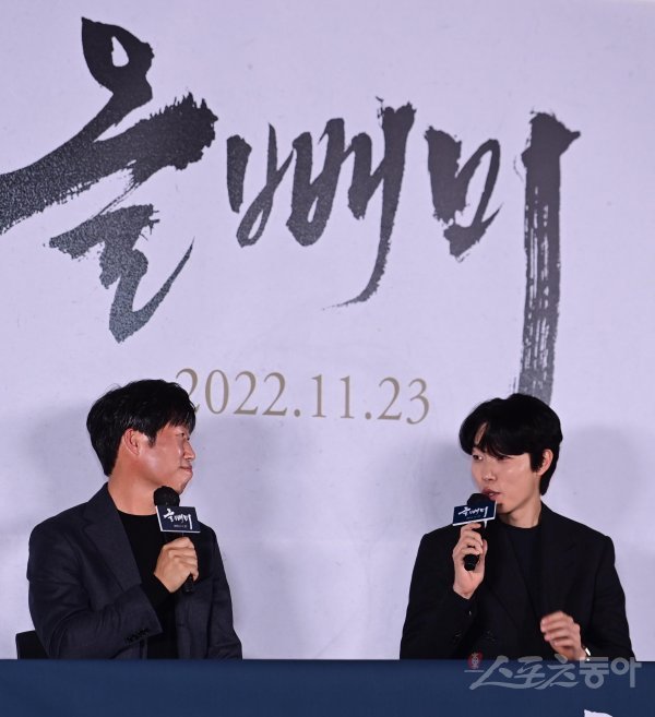 배우 유해진과 류준열이 10일 서울 용산구 CGV용산아이파크몰점에서 열린 영화 ‘올빼미’ 언론시사회에서 이야기를 하고 있다.