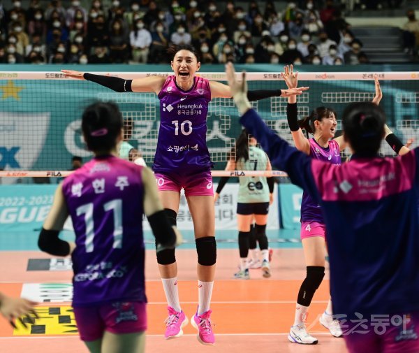 10일 서울 장충체육관에서 열린 ‘2022-2023 도드람 V-리그’ 여자부 GS칼텍스와 흥국생명의 경기에서 세트스코어 3-0으로 승리한 흥국생명 김연경이 기뻐하고 있다.