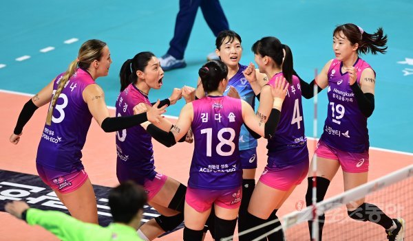 10일 서울 장충체육관에서 열린 ‘2022-2023 도드람 V-리그’ 여자부 GS칼텍스와 흥국생명의 경기에서 흥국생명 선수들이 득점에 성공한 후 기쁨을 나누고 있다.