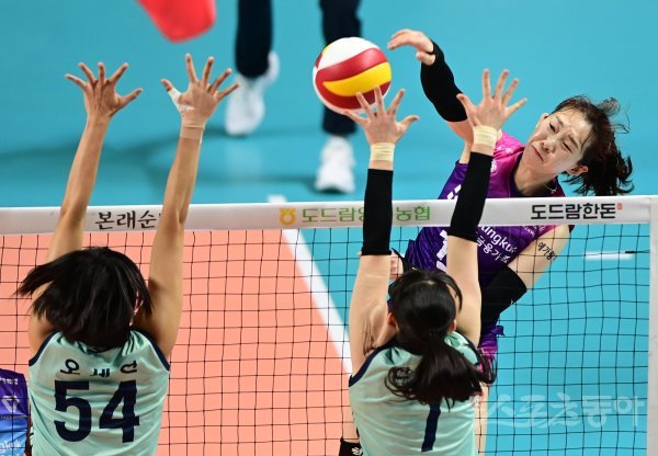 10일 서울 장충체육관에서 열린 ‘2022-2023 도드람 V-리그’ 여자부 GS칼텍스와 흥국생명의 경기에서 흥국생명 김미연이 GS칼텍스 블로커 앞에서 스파이크를 하고 있다.