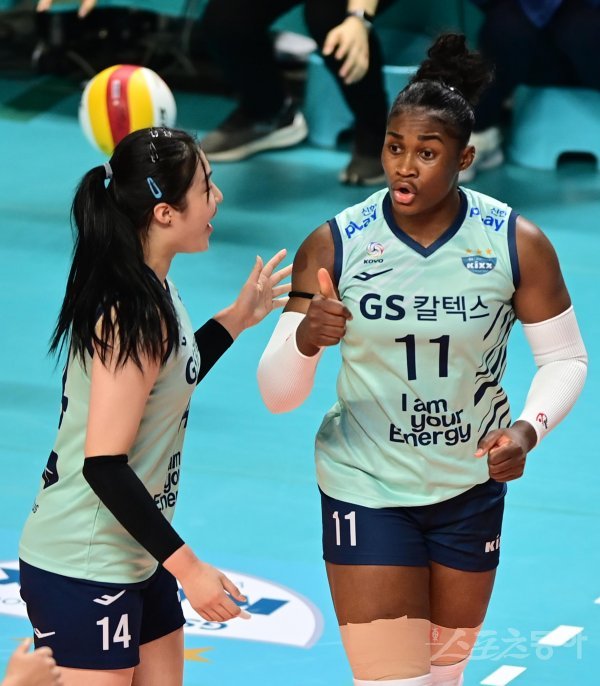 10일 서울 장충체육관에서 열린 ‘2022-2023 도드람 V-리그’ 여자부 GS칼텍스와 흥국생명의 경기에서 GS칼텍스 모마가 득점에 성공한 후 세리머니하고 있다.