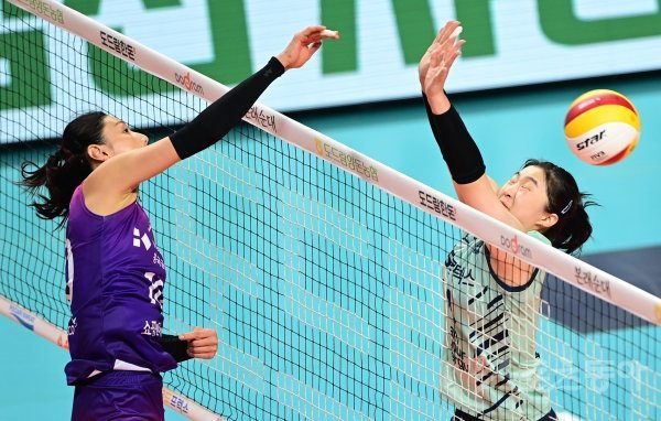 10일 서울 장충체육관에서 열린 ‘2022-2023 도드람 V-리그’ 여자부 GS칼텍스와 흥국생명의 경기에서 흥국생명 김연경이 GS칼텍스 김지원 앞에서 스파이크를 하고 있다.