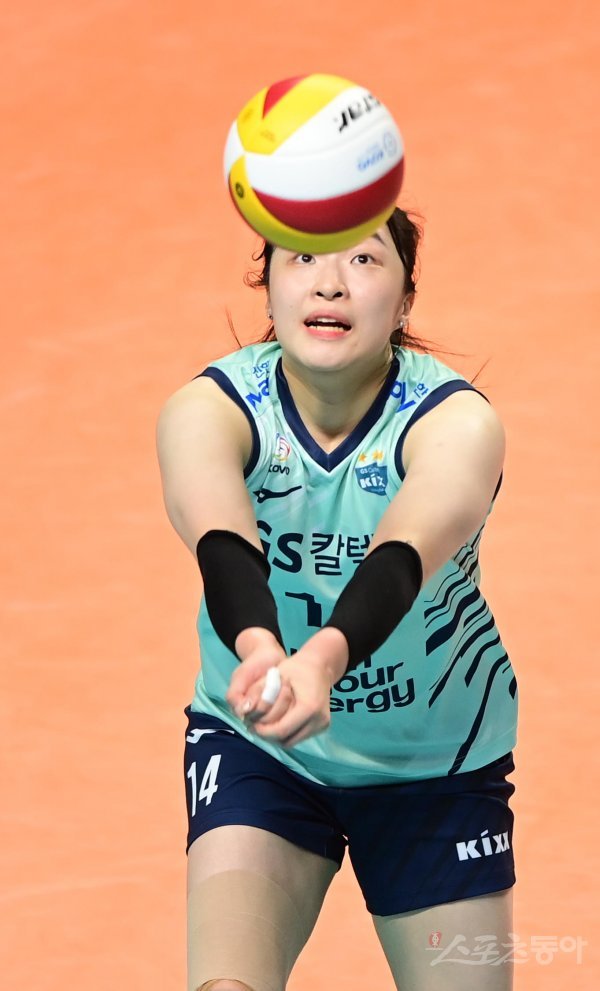 10일 서울 장충체육관에서 열린 ‘2022-2023 도드람 V-리그’ 여자부 GS칼텍스와 흥국생명의 경기에서 GS칼텍스 김지원이 리시브를 하고 있다.