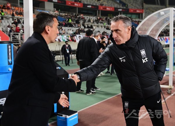 11일 경기 화성종합경기타운에서 열린 ‘하나은행 초청 축구국가대표팀 친선경기’ 2022 카타르 월드컵 대비 마지막 국내 평가전 한국과 아이슬란드의 경기에 앞서 한국 파울루 벤투 감독이 아이슬란드 아르나르 비다르손 감독과 악수하고 있다.