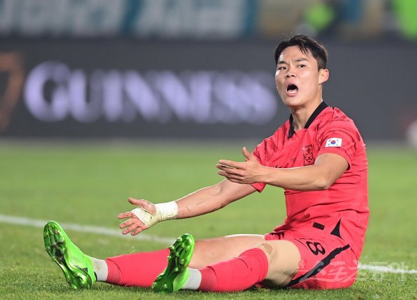 11일 경기 화성종합경기타운에서 열린 ‘하나은행 초청 축구국가대표팀 친선경기’ 2022 카타르 월드컵 대비 마지막 국내 평가전 한국과 아이슬란드의 경기에서 한국 오현규가 골 찬스를 놓친 후 아쉬워하고 있다.