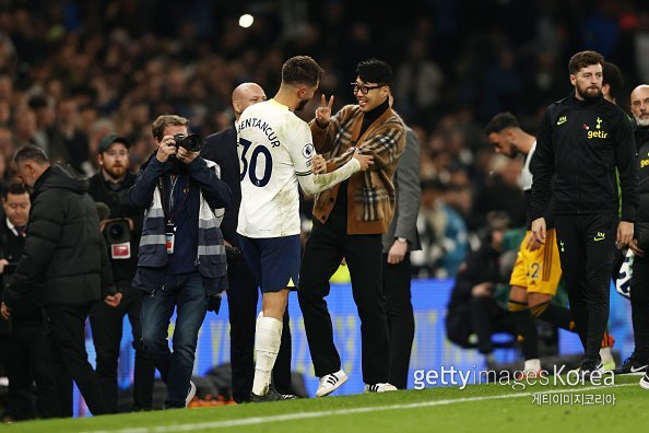 성공적으로 안와골절 수술을 받은 손흥민(오른쪽)이 13일(한국시간) 런던 토트넘 홋스퍼 스타디움에서 열린 리즈 유나이티드와 2022∼2023시즌 잉글랜드 프리미어리그 16라운드 홈경기를 현장에서 직접 지켜봤다. 토트넘의 4-3 역전승 직후 이날 멀티골을 터트린 로드리고 벤탄쿠르와 반갑게 해후한 손흥민. 사진=게티이미지코리아