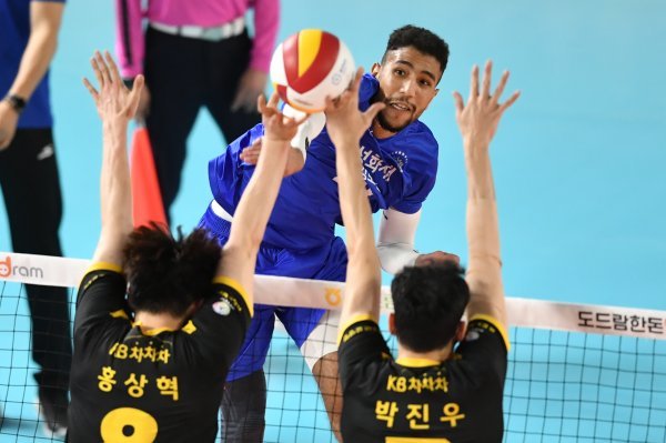 삼성화재 이크바이리(뒤)가 13일 대전충무체육관에서 벌어진 KB손해보험과 홈경기 도중 상대 블로킹을 뚫고 있다. 이크바이리의 42득점 폭발에 힘입어 삼성화재가 시즌 첫 승을 거뒀다. 사진제공 | KOVO
