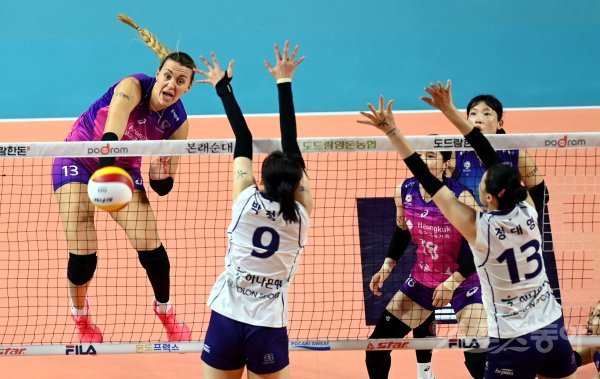 13일 인천 삼산월드체육관에서 ‘2022-2023 도드람 V리그’ 인천 흥국생명과 김천 한국도로공사의 여자부 경기가 열렸다. 흥국생명 옐레나가 한국도로공사 블로커를 피해 스파이크를 날리고 있다.