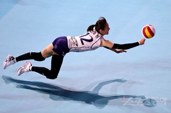 13일 인천 삼산월드체육관에서 ‘2022-2023 도드람 V리그’ 인천 흥국생명과 김천 한국도로공사의 여자부 경기가 열렸다. 한국도로공사 문정원이 몸을 날려 수비를 펼치고 있다.