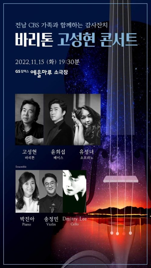 바리톤 고성현 콘서트가 11월 15일 오후 7시 30분 전남 여수시 GS칼텍스 예울마루 소극장에서 열린다. 전남 CBS가 주최·주관하는 콘서트로 ‘전남 CBS 가족과 함께 하는 감사잔치’이다.