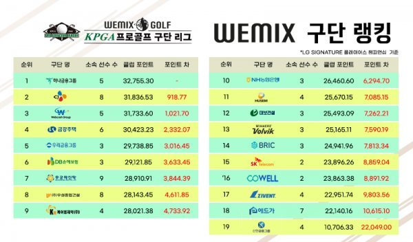 지난 4월 창설된 ‘위믹스 2022 KPGA 프로골프 구단 리그’는 금강주택, 대보그룹, 도휘에드가, 무궁화신탁, 볼빅, 신한금융그룹, 우리금융그룹, 우성종합건설, 웹케시그룹, 지벤트, 케이엠제약, 하나금융그룹, 휴셈, BRIC, CJ, DB손해보험, NH농협은행, SK텔레콤, COWELL(코웰)까지 총 19개 구단이 참여했다.