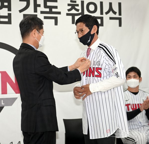 LG 트윈스 제14대 사령탑 염경엽 감독이 14일 서울 잠실야구장에서 진행된 취임식에서 유니폼을 착용하고 있다.
