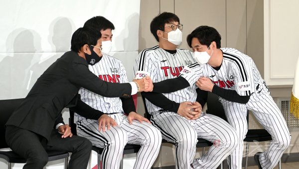 LG 트윈스 제14대 사령탑 염경엽 감독이 14일 서울 잠실야구장에서 진행된 취임식에서 진해수와 인사를 하고 있다.
