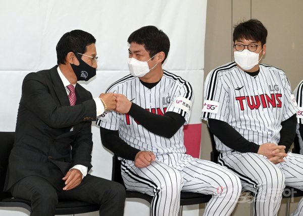 LG 트윈스 제14대 사령탑 염경엽 감독이 14일 서울 잠실야구장에서 진행된 취임식에서 오지환과 인사를 하고 있다.