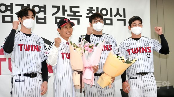 LG 트윈스 제14대 사령탑 염경엽 감독이 14일 서울 잠실야구장에서 진행된 취임식에서 진해수, 김현수, 오지환과 기념촬영을 하고 있다.